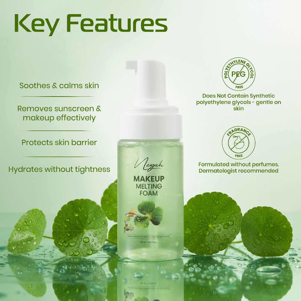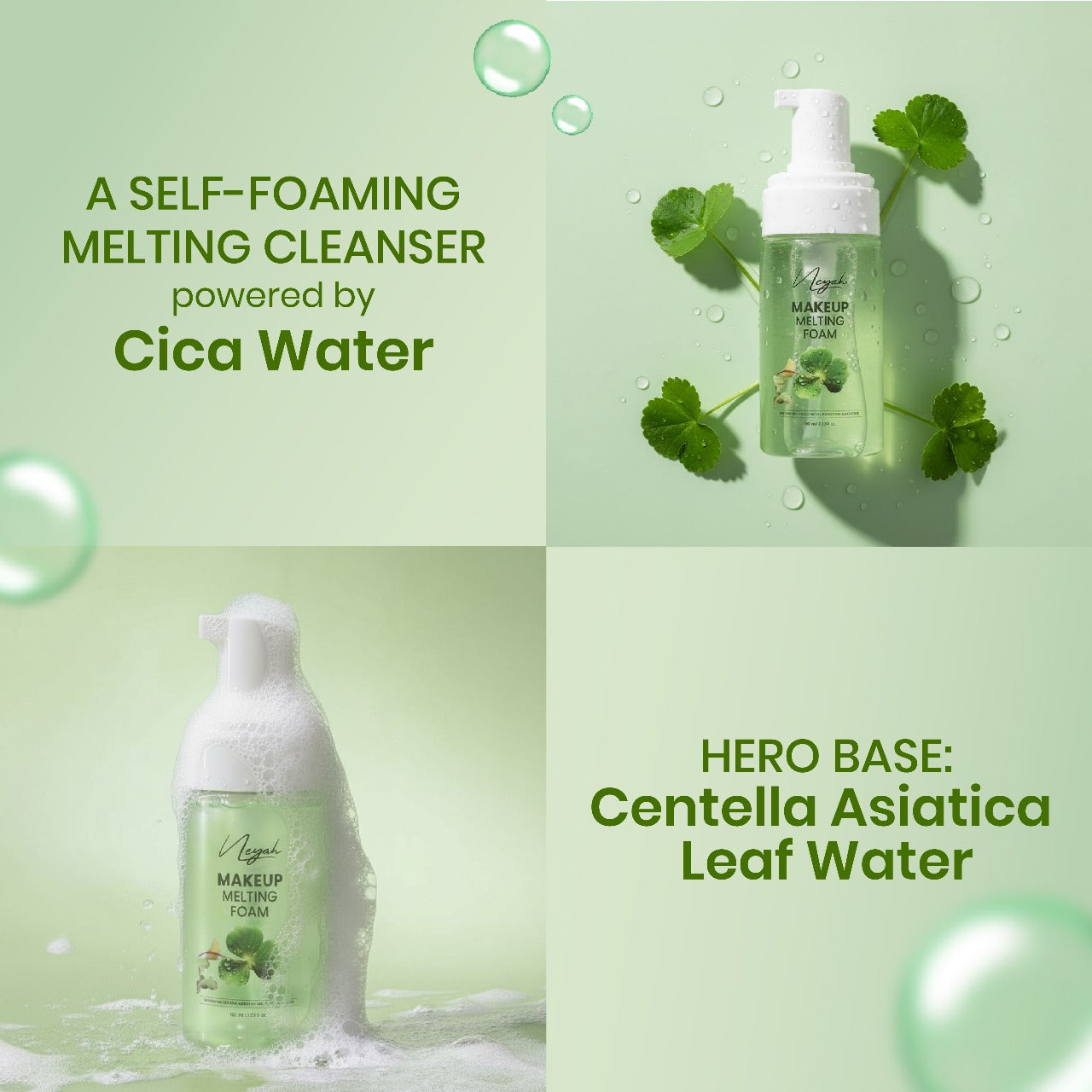 Experience a new level of gentle yet effective cleansing with Neyah Makeup Melting Foam — powered by Centella Asiatica Leaf Water (Cica) to calm, hydrate, and protect sensitive skin. This innovative formula transforms into airy micro-bubbles that effortlessly melt away waterproof makeup, sunscreen, and daily impurities without stripping or irritating the skin.